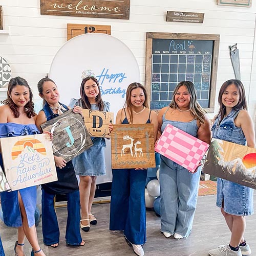 We also offer DIY Minis: Canvas or Wood, a flexible workshop style that lets guests choose the project medium that fits their style and budget. Prefer the clean, modern look of canvas? Go for a canvas painting party! Love the natural warmth of wood décor? That’s an option too.